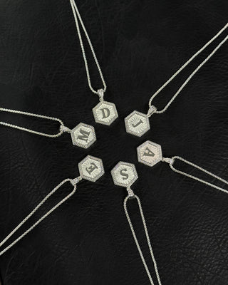 Halskjede med bokstavanheng i 925 sølvbelagt resirkulert messing, med hvite skinnende steiner.